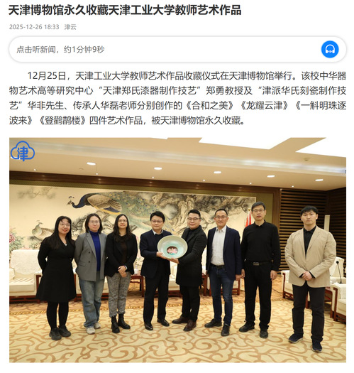 12月25日,天津工业大学教师艺术作品收藏仪式在天津博物馆举行。该校中华器物艺术高等研究中心“天津郑氏漆器制作技艺”郑勇教授及“津派华氏刻瓷制作技艺”华非先生、传承人华磊老师分别创作的《合和之美》《龙耀云津》《一斛明珠逐波来》《登鹳鹊楼》四件艺术作品,被天津博物馆永久收藏。