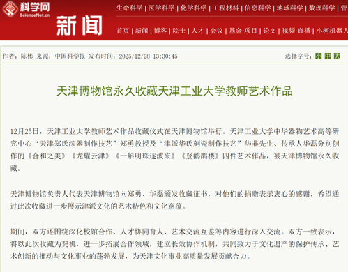 12月25日,天津工业大学教师艺术作品收藏仪式在天津博物馆举行。天津工业大学中华器物艺术高等研究中心“天津郑氏漆器制作技艺”郑勇教授及“津派华氏刻瓷制作技艺”华非先生、传承人华磊分别创作的《合和之美》《龙耀云津》《一斛明珠逐波来》《登鹳鹊楼》四件艺术作品,被天津博物馆永久收藏。