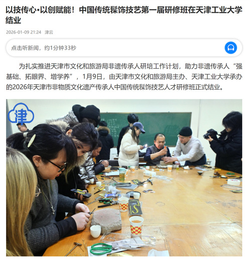 为扎实推进天津市文化和旅游局非遗传承人研培工作计划,助力非遗传承人“强基础、拓眼界、增学养”,1月9日,由天津市文化和旅游局主办、天津工业大学承办的2026年天津市非物质文化遗产传承人中国传统髹饰技艺人才研修班正式结业。