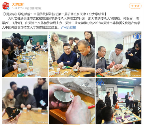 【以技传心·以创赋能!中国传统髹饰技艺第一届研修班在天津工业大学结业】为扎实推进天津市文化和旅游局非遗传承人研培工作计划,助力非遗传承人“强基础、拓眼界、增学养”,1月9日,由天津市文化和旅游局主办、天津工业大学承办的2026年天津市非物质文化遗产传承人中国传统髹饰技艺人才研修班正式结业。