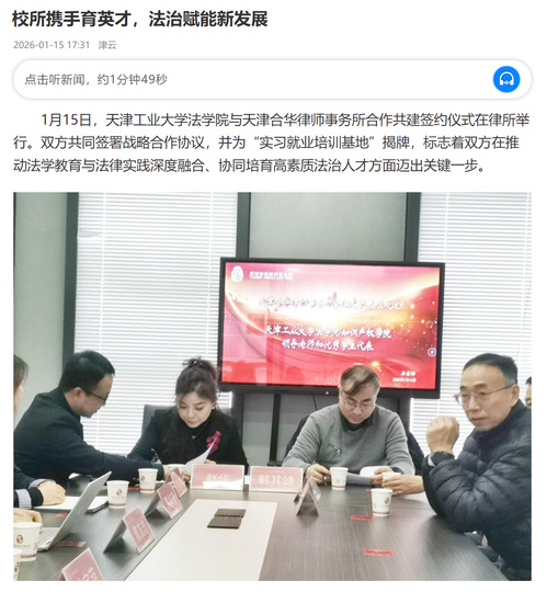 1月15日,天津工业大学法学院与天津合华律师事务所合作共建签约仪式在律所举行。双方共同签署战略合作协议,并为“实习就业培训基地”揭牌,标志着双方在推动法学教育与法律实践深度融合、协同培育高素质法治人才方面迈出关键一步。