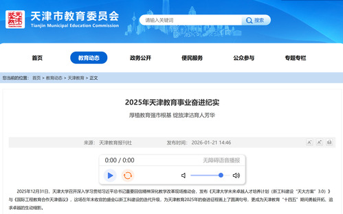 2025年12月31日,天津大学召开深入学习贯彻习近平总书记重要回信精神深化教学改革现场推动会,发布《天津大学未来卓越人才培养计划(新工科建设“天大方案”3.0)》与《国际工程教育合作天津倡议》,这场在年末收官的盛会以新工科建设的迭代升级,为天津教育2025年的奋进征程画上了圆满句号,更成为天津教育“十四五”期间勇毅开拓、追求卓越的生动缩影。