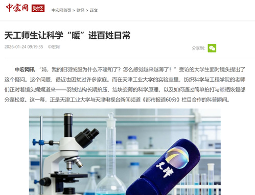 中宏网讯 “妈,我的旧羽绒服为什么不暖和了?怎么感觉越来越薄了!”受访的大学生面对镜头提出了这个疑问。这个问题,最近也困扰过许多家庭。而在天津工业大学的实验室里,纺织科学与工程学院的老师们正对着镜头娓娓道来——羽绒结构长期挤压、结块变薄的科学原理,以及如何通过简单拍打与晾晒恢复部分蓬松度。这一幕,正是天津工业大学与天津电视台新闻频道《都市报道60分》栏目合作的科普瞬间。