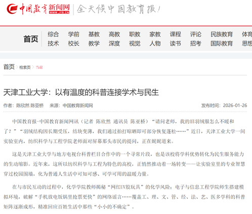中国教育报-中国教育新闻网讯(记者 陈欣然 通讯员 陈亚桥)“请问老师,我的旧羽绒服怎么不暖和了?”“羽绒结构因长期受压,结块变薄,我们通过拍打晾晒即可部分恢复蓬松……”近日,天津工业大学一间实验室内,纺织科学与工程学院老师面对屏幕那头市民的提问,正在娓娓道来。