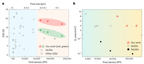 图4. 不同类型高分辨率LED的平均EQE和EL面积比较。(a)本工作与其他工作在平均EQE﹑像素密度和像素尺寸的性能对比。(b)本工作与其他工作在电致发光面积的对比。