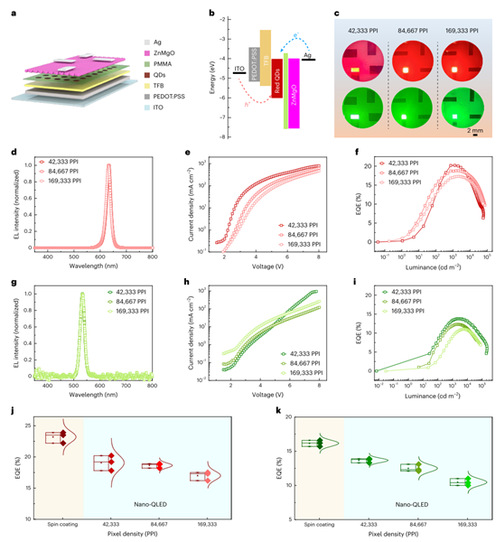 图3. 超高分辨率红色和绿色纳米QLED的特性。(a)超高分辨率纳米QLED器件结构示意图。(b)器件能级图。(c)红色与绿色纳米QLED的电致发光(EL)图。(d-f)不同PPI红色纳米 QLED 的性能曲线。包括EL光谱、电流密度-电压(J-V)以及外量子效率-亮度(EQE–L)特性。(g-i)不同PPI绿色纳米QLED的性能曲线。分别对应EL光谱、J-V以及EQE–L特性曲线。(j,k)不同PPI器件与旋涂法参考器件的EQE对比。