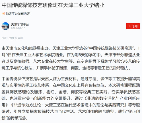 由天津市文化和旅游局主办、天津工业大学承办的“中国传统髹饰技艺研修班”,1月9日在天津工业大学艺术学院结业。在为期6天的学习中,天津市部分非遗从业者以及高校教师、艺术专业在校大学生等,在专家指导下系统学习髹饰技艺的传统工序与核心技法,并亲手体验了雕漆、刻瓷、金缮等非遗工艺的独特魅力。