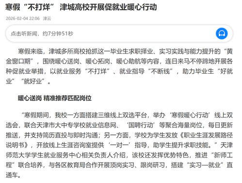 “寒假期间,我校一方面搭建三维线上双选平台,举办‘寒假暖心行动’线上双选会,联合天津市大中专学校就业信息网、‘国聘行动’等聚合海量岗位,每日更新推送,并支持简历直投与即时沟通;另一方面,学校为学生发放《职业生涯发展路径说明书》,开放线上生涯咨询室提供‘一对一’指导,助学生提升求职技能。”天津师范大学学生就业服务中心相关负责人介绍,该校还发挥优势特色,推进“新师工程”联合培养,与各区教育局合作开展顶岗实习、跟岗研习,搭建“实习—就业”直通车。