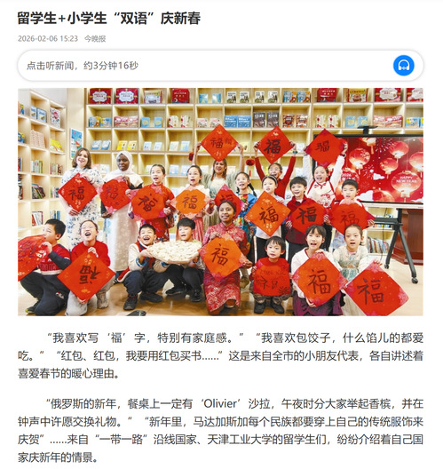 一起表演节目、写“福”字、包饺子、互相交换礼物,昨日上午,“丝路新年汇——中外学生共话春节”全民阅读活动在少儿阅读空间暖心启幕,4名“一带一路”沿线国家留学生与中国小学生以书为桥,共赴一场新春文化交融之约。