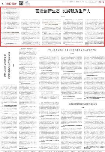 科技创新和产业创新深度融合,是发展新质生产力的内在要求,而科技创新、产业创新是否深度融合,关键在于创新生态是否优良。建设现代化大都市,须在创新生态建设上取得关键突破,以高效活力生态涵养新质生产力,以深层次改革开放拓展新空间、激发新动能,在高质量发展新征程上展现新作为。