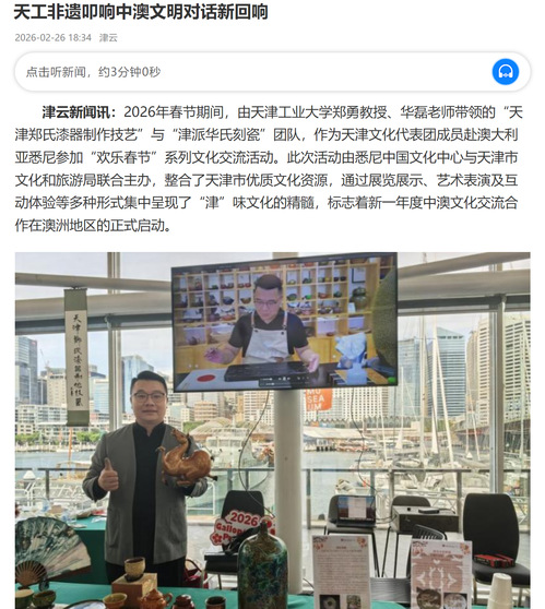 津云新闻讯:2026年春节期间,由天津工业大学郑勇教授、华磊老师带领的“天津郑氏漆器制作技艺”与“津派华氏刻瓷”团队,作为天津文化代表团成员赴澳大利亚悉尼参加“欢乐春节”系列文化交流活动。此次活动由悉尼中国文化中心与天津市文化和旅游局联合主办,整合了天津市优质文化资源,通过展览展示、艺术表演及互动体验等多种形式集中呈现了“津”味文化的精髓,标志着新一年度中澳文化交流合作在澳洲地区的正式启动。