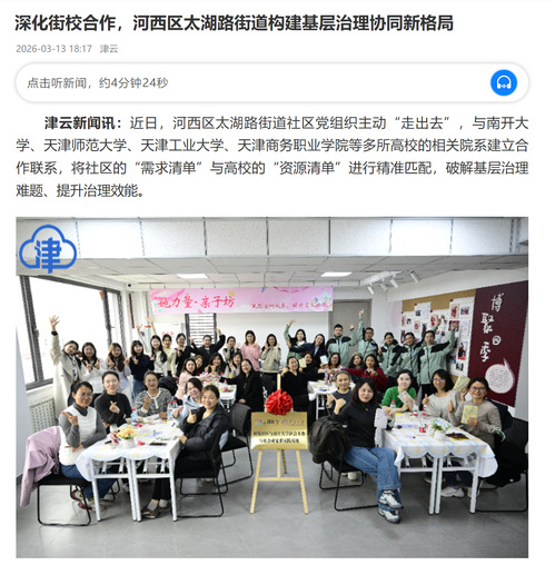 街校合作系列探索与实践,为破解基层治理难题、提升治理效能提供了可复制的“太湖方案”,未来,河西区太湖路街道将持续深化街校协同治理模式,将其作为落实河西区“十五五”发展规划、加快建设新梅江高端产业和宜居生活样板区的重要基石与创新引擎,在服务区域发展战略大局中展现更大作为。