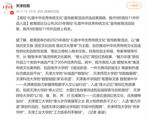据了解,教育部举办的2025年高校“礼敬中华优秀传统文化”宣传教育活动,以“赓续历史文脉 坚定文化自信 推动文化繁荣”为主题,旨在推动中华优秀传统文化创造性转化和创新性发展,落实立德树人根本任务。经高校自主申报、专家审核等环节,从“数智未来”焕活传统文化案例、“烽火记忆”高校红色故事、“魅力非遗”原创作品三个类别中遴选产生了305件优秀作品。其中,我市高校入选“数智未来”焕活传统文化案例的,包括南开大学的“《瓷说新语:一件元青花的诞生》陶瓷制作虚拟仿真实验平台”、天津大学的“长城遗产数智化”、天津师范大学的“华韵数展阁”、天津科技大学的“数智赋能‘津’彩非遗”、天津美术学院的“笔墨映文脉 数智溯中华——天津美院助力新疆策勒数字人文公益行动”;入选“烽火记忆”高校红色故事的,包括天津大学的“烽火记忆:太雷红色故事讲述的实践探索与创新路径”、天津财经大学的“以‘馆、像、影、声、行’五维聚力——沉浸式浸润红色文化,点亮精神坐标”、天津理工大学的“烽火岁月铸强军之志 薪火相传燃赤子之心”;入选“魅力非遗”原创作品的,包括天津交通职业学院的“烈焰中的图腾”、天津师范大学的“传承华粹”、天津工业大学的“工大版系列手鞠球”。(记者 姜凝)