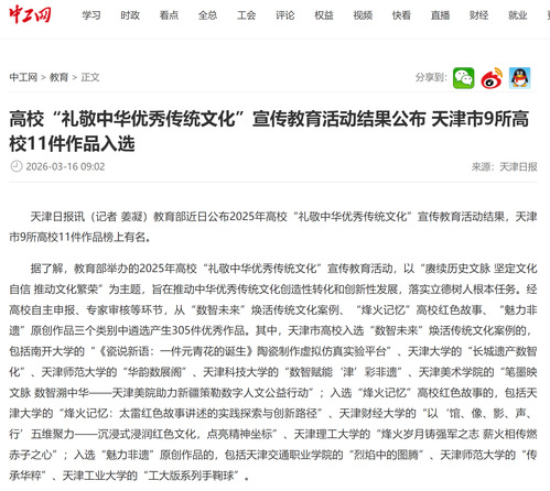 据了解,教育部举办的2025年高校“礼敬中华优秀传统文化”宣传教育活动,以“赓续历史文脉 坚定文化自信 推动文化繁荣”为主题,旨在推动中华优秀传统文化创造性转化和创新性发展,落实立德树人根本任务。经高校自主申报、专家审核等环节,从“数智未来”焕活传统文化案例、“烽火记忆”高校红色故事、“魅力非遗”原创作品三个类别中遴选产生305件优秀作品。其中,天津市高校入选“数智未来”焕活传统文化案例的,包括南开大学的“《瓷说新语:一件元青花的诞生》陶瓷制作虚拟仿真实验平台”、天津大学的“长城遗产数智化”、天津师范大学的“华韵数展阁”、天津科技大学的“数智赋能‘津’彩非遗”、天津美术学院的“笔墨映文脉 数智溯中华——天津美院助力新疆策勒数字人文公益行动”;入选“烽火记忆”高校红色故事的,包括天津大学的“烽火记忆:太雷红色故事讲述的实践探索与创新路径”、天津财经大学的“以‘馆、像、影、声、行’五维聚力——沉浸式浸润红色文化,点亮精神坐标”、天津理工大学的“烽火岁月铸强军之志 薪火相传燃赤子之心”;入选“魅力非遗”原创作品的,包括天津交通职业学院的“烈焰中的图腾”、天津师范大学的“传承华粹”、天津工业大学的“工大版系列手鞠球”。