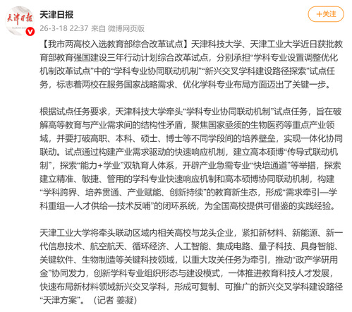 【我市两高校入选教育部综合改革试点】天津科技大学、天津工业大学近日获批教育部教育强国建设三年行动计划综合改革试点,分别承担“学科专业设置调整优化机制改革试点”中的“学科专业协同联动机制”“新兴交叉学科建设路径探索”试点任务,标志着两校在服务国家战略需求、优化学科专业布局方面迈出了关键一步。
