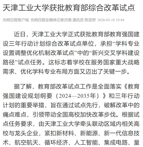 据了解,教育部改革试点工作是全面落实《教育强国建设规划纲要(2024—2035年)》和三年行动计划的重要举措,旨在通过试点先行,破解改革中的痛点难点,引领带动全国高校加快改革步伐。根据试点任务要求,由天津工业大学牵头联动区域内相关高校与龙头企业,紧扣新材料、新能源、新一代信息技术、航空航天、循环经济、人工智能、集成电路、量子科技、具身智能、关键软件、生物制造等关键科技领域,以重大攻关任务为牵引,推动政产学研用金多方协同发力,创新学科专业组织形态与建设模式,一体推进教育科技人才发展,快速布局新材料领域新兴交叉学科,形成可复制、可推广的“新兴交叉学科建设路径”天津方案。