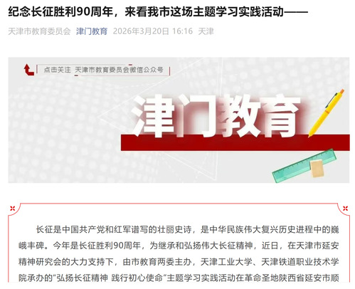 长征是中国共产党和红军谱写的壮丽史诗,是中华民族伟大复兴历史进程中的巍峨丰碑。今年是长征胜利90周年,为继承和弘扬伟大长征精神,近日,在天津市延安精神研究会的大力支持下,由市教育两委主办,天津工业大学、天津铁道职业技术学院承办的“弘扬长征精神 践行初心使命”主题学习实践活动在革命圣地陕西省延安市顺利举行。市有关部门、各区教育局、各有关高校、市教委直属学校负责同志以及大中小学师生代表100余人参加学习实践活动。