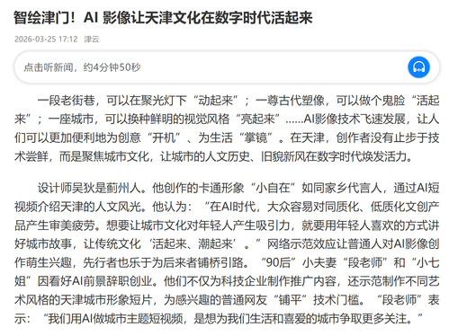 从短视频到影视作品,从课堂实践到产业发展,天津的AI影像创作者们以技术创新赋能文化传承,让智能向善、文化向新,用AI重绘城市文化影像,走出一条兼具文化情怀与产业发展的特色之路,书写属于津门的数字时代新篇章。