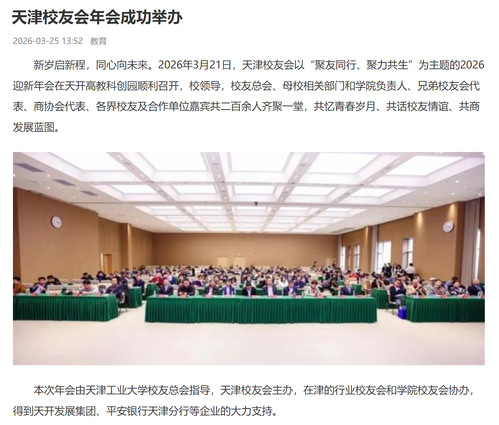 新岁启新程,同心向未来。2026年3月21日,天津校友会以“聚友同行、聚力共生”为主题的2026迎新年会在天开高教科创园顺利召开,校领导,校友总会、母校相关部门和学院负责人、兄弟校友会代表、商协会代表、各界校友及合作单位嘉宾共二百余人齐聚一堂,共忆青春岁月、共话校友情谊、共商发展蓝图。