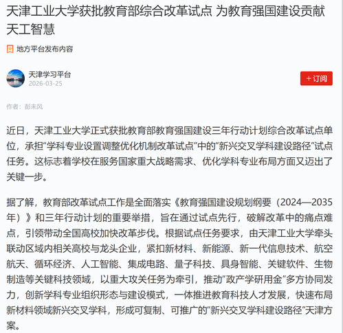 据了解,教育部改革试点工作是全面落实《教育强国建设规划纲要(2024—2035年)》和三年行动计划的重要举措,旨在通过试点先行,破解改革中的痛点难点,引领带动全国高校加快改革步伐。根据试点任务要求,由天津工业大学牵头联动区域内相关高校与龙头企业,紧扣新材料、新能源、新一代信息技术、航空航天、循环经济、人工智能、集成电路、量子科技、具身智能、关键软件、生物制造等关键科技领域,以重大攻关任务为牵引,推动“政产学研用金”多方协同发力,创新学科专业组织形态与建设模式,一体推进教育科技人才发展,快速布局新材料领域新兴交叉学科,形成可复制、可推广的“新兴交叉学科建设路径”天津方案。
