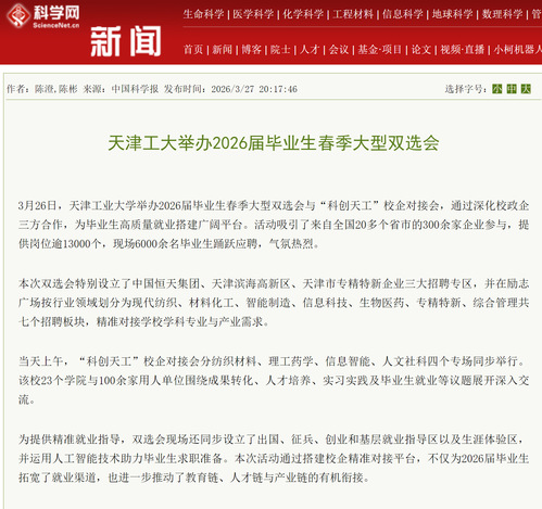 3月26日,天津工业大学举办2026届毕业生春季大型双选会与“科创天工”校企对接会,通过深化校政企三方合作,为毕业生高质量就业搭建广阔平台。活动吸引了来自全国20多个省市的300余家企业参与,提供岗位逾13000个,现场6000余名毕业生踊跃应聘,气氛热烈。