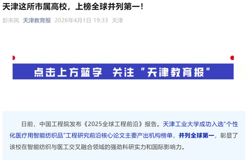 日前,中国工程院发布《2025全球工程前沿》报告。天津工业大学成功入选“个性化医疗用智能纺织品”工程研究前沿核心论文主要产出机构榜单,并列全球第一,彰显了该校在智能纺织与医工交叉融合领域的强劲科研实力和国际影响力。