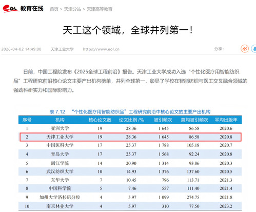 “个性化医疗用智能纺织品”是纺织工程、微电子、信息科学与生物医学深度交叉融合的前沿方向,入选中国工程院环境与轻纺工程领域Top10工程研究前沿,已成为纺织科技跨界融合发展的代表性领域。报告显示,我国在该领域科研产出优势显著,核心论文和施引核心论文占比均位居世界第一。其中,核心论文占比达91.04%,施引核心论文占比达64.45%,充分表明我国在该研究方向上已形成强大的原创能力和国际学术影响力。作为主要产出机构之一,天津工业大学并列全球第一,充分体现了学校在该领域持续深耕所取得的重要成果。近年来,学校紧紧围绕纺织科学与工程学科国家“双一流”建设目标,持续优化学科布局,强化有组织科研,先后成立天津工业大学纺织未来技术研究中心、先进纺织复合材料学科交叉中心、纺织复合材料及其装备学科与技术中心等高水平科研平台,不断拓展纺织学科发展新空间。学校坚持“四个面向”,深度汇聚纺织科学、材料科学、信息科学、人工智能、数学、控制科学与工程等多学科资源,聚焦未来产业和科技制高点,着力打破学科壁垒,构建交叉融合创新生态。在交叉学科建设方面,学校主动服务新工科发展和国家战略需求,自主设置智能可穿戴技术与工程等9个交叉学科博士点,着力培养具有家国情怀、国际视野、跨学科思维和创新能力的高层次复合型人才。2026年,学校入选教育部教育强国建设三年行动计划综合改革试点单位,承担“学科专业设置调整优化机制改革试点”中“新兴交叉学科建设路径”试点任务,进一步为学校高质量发展注入新动能。下一步,学校将立足纺织学科特色优势,持续深化学科交叉融合,强化前沿技术攻关,加快创新成果转化,努力产出更多具有引领性、标志性和国际影响力的高水平成果,为建设纺织强国、加快实现高水平科技自立自强作出新的更大贡献。