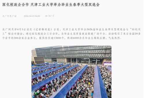 央广网天津4月3日消息(记者韩雨晨)日前,天津工业大学举办2026届毕业生春季大型双选会与“科创天工”校企对接会,通过深化校政企三方合作,为毕业生高质量就业搭建广阔平台。活动吸引了来自全国20多个省市的300余家企业参与,提供岗位逾13000个,现场6000余名毕业生踊跃应聘,气氛热烈。