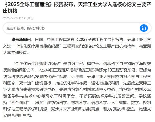 津云新闻讯:日前,中国工程院发布《2025全球工程前沿》报告。天津工业大学入选“个性化医疗用智能纺织品”工程研究前沿核心论文主要产出机构榜单,与亚洲大学并列榜首。
