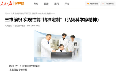 人民日报客户端丨天津工业大学教授陈利带领团队研制多种航天新型材料——三维编织 实现性能“精准定制”(弘扬科学家精神)
