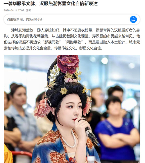 津城花海盛放,游人穿梭如织,其中不乏褒衣博带、襟飘带舞的汉服爱好者的身影。从春季踏青到花朝雅集,从古建街巷到文化课堂,穿汉服的市民越来越常见。他们选择的汉服不再追求“影视同款”“网购爆款”,而是通过融入本土设计、城市元素和传统技艺提升文化含金量,传播传统文化、彰显文化自信。