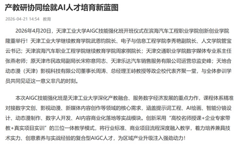2026年4月20日,天津工业大学AIGC技能强化班开班仪式在滨海汽车工程职业学院创新创业学院隆重举行!天津工业大学继续教育学院武恩钧院长、电子与信息工程学院李秀艳副院长、人文学院管宝云书记;天津滨海汽车职业工程学院继续教育学院周家祺院长;天津交通职业学院数字媒体专业系主任张燕老师;原天津市民政局副局长宋称意同志、天津乐达汽车销售服务有限公司运营总监史峰;天地合动态漫(天津)影视科技有限公司董事长周涛、总经理王峙教授等政企校代表齐聚一堂,与全体参训学员共同见证这一意义非凡的时刻。